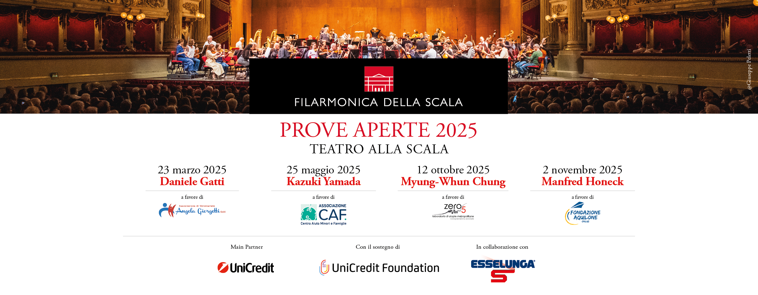 Il progetto Prove Aperte è frutto della collaborazione tra la Filarmonica della Scala – con la generosa partecipazione dei direttori, dei solisti ospiti e di tutti i musicisti – il Teatro alla Scala, il Comune di Milano, il Main Partner della Filarmonica UniCredit, UniCredit Foundation – che partecipa all’individuazione dei progetti beneficiari e contribuisce alla copertura dei costi organizzativi – ed Esselunga, partner del progetto dalla decima edizione. ViviMilano e Radio Popolare sono Media Partner. Il coordinamento generale è affidato ad Aragorn.