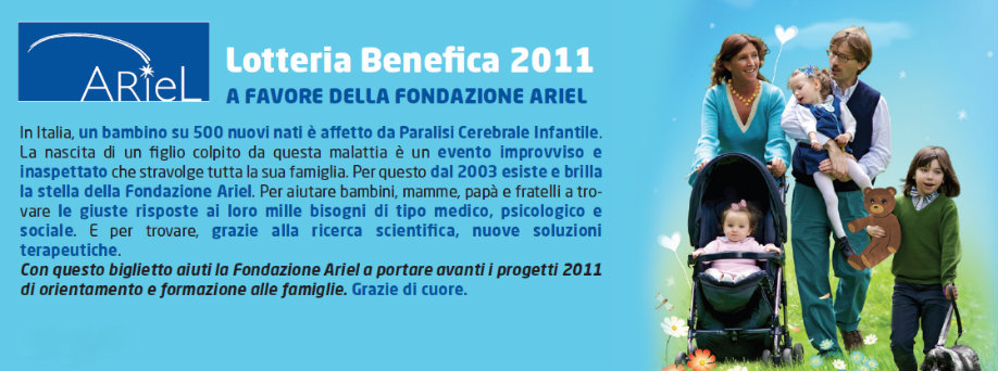 Con soli 2 euro puoi vincere e sostenere i progetti della Fondazione Ariel Una vacanza “I Grandi Viaggi” per due persone in Calabria, un netbook Acer, un climatizzatore Daikin e ancora due biglietti per una rappresentazione lirica offerti dall’Arena di Verona e un TV LCD Acer. Sono solo alcuni dei sessanta premi messi in palio nella Lotteria Benefica il cui ricavato sosterrà i progetti della Fondazione Ariel che, dal 2003, assiste le famiglie con bambini affetti da Paralisi Cerebrale Infantile e altre...