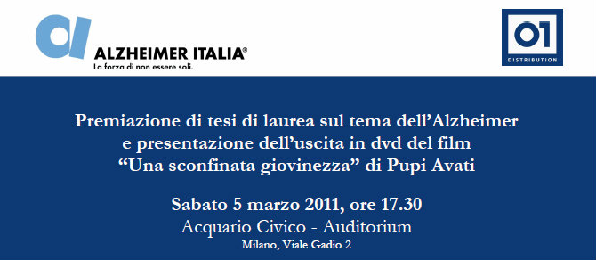 Sabato 5 marzo 2011, alle ore 17.30, presso l’Acquario Civico di Milano (viale Gadio, 2) la Federazione Alzheimer Italia premierà – grazie al contributo della bresciana Millenium Sport & Fitness – 8 giovani laureati che si sono distinti nella realizzazione di tesi sulla malattia di Alzheimer. Nell’occasione, alla presenza del regista Pupi Avati, sarà presentata l’uscita in DVD del film “Una sconfinata giovinezza” (01 Distribution) che ospita lo spot video istituzionale della Federazione, realizzato dall’agenzia pubblicitaria Enfantes Terribles. All’evento saranno presenti anche Giampaolo Landi di Chiavenna, Assessore alla Salute del Comune di Milano, e Adriano Pintaldi, autore del documentario “Pupi Avati, un poeta fuori dal coro”, incluso tra i contenuti extra del DVD. Modera Alessandra De Luca di Avvenire. L’evento costituirà anche l’occasione per sensibilizzare il pubblico sulla drammaticità della malattia di Alzheimer che colpisce oltre 36 milioni di persone nel mondo.