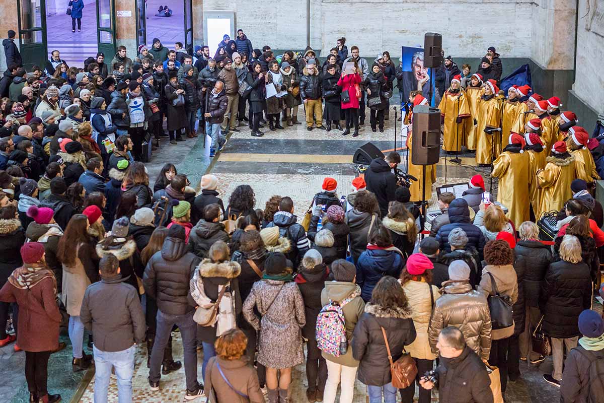 La grande affluenza di pubblico registrata negli anni è stata, poi, la leva che ci ha consentito di regalare un altro momento di musica e solidarietà alla città di Milano. In sinergia con Progetto Arca, infatti, abbiamo verificato la possibilità di dare vita a un concerto gospel nell’atrio della Stazione Centrale di Milano, luogo simbolo dell’accoglienza dei migranti, cui Fondazione Progetto Arca offre il primo aiuto umanitario al loro arrivo nel capoluogo lombardo. La sera del 18 dicembre, quindi, l’atrio della stazione si è trasformato in un palcoscenico e i brani natalizi eseguiti dal coro Jazz Gospel Alchemy sono riusciti a portare un po’ di Natale in un luogo “freddo” e di passaggio: anche i viaggiatori, solitamente distratti, per una volta si sono fermati e hanno chiesto informazioni ai volontari della Fondazione. Inoltre, grazie all’attività di ufficio stampa e alla diffusione della notizia sui canali web, questo secondo speciale concerto ha permesso a Progetto Arca di raggiungere un obiettivo quasi inaspettato: raccogliere altre, nuove coperte per le persone senza dimora.