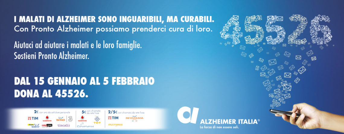 Fino al 26 giugno numero solidale 45526 a sostegno della Federazione Alzheimer Fino al 26 giugno con un sms o una chiamata da rete fissa al 45526 è possibile sostenere Pronto Alzheimer, la linea telefonica della Federazione Alzheimer Italia che offre un servizio di orientamento, assistenza e sostegno ai familiari dei malati. L’Alzheimer è la più comune causa di demenza: ne rappresenta infatti il 60% dei casi. In Italia si stima che siano 1.242.000 le persone con demenza, destinate a diventare 1.609.000...